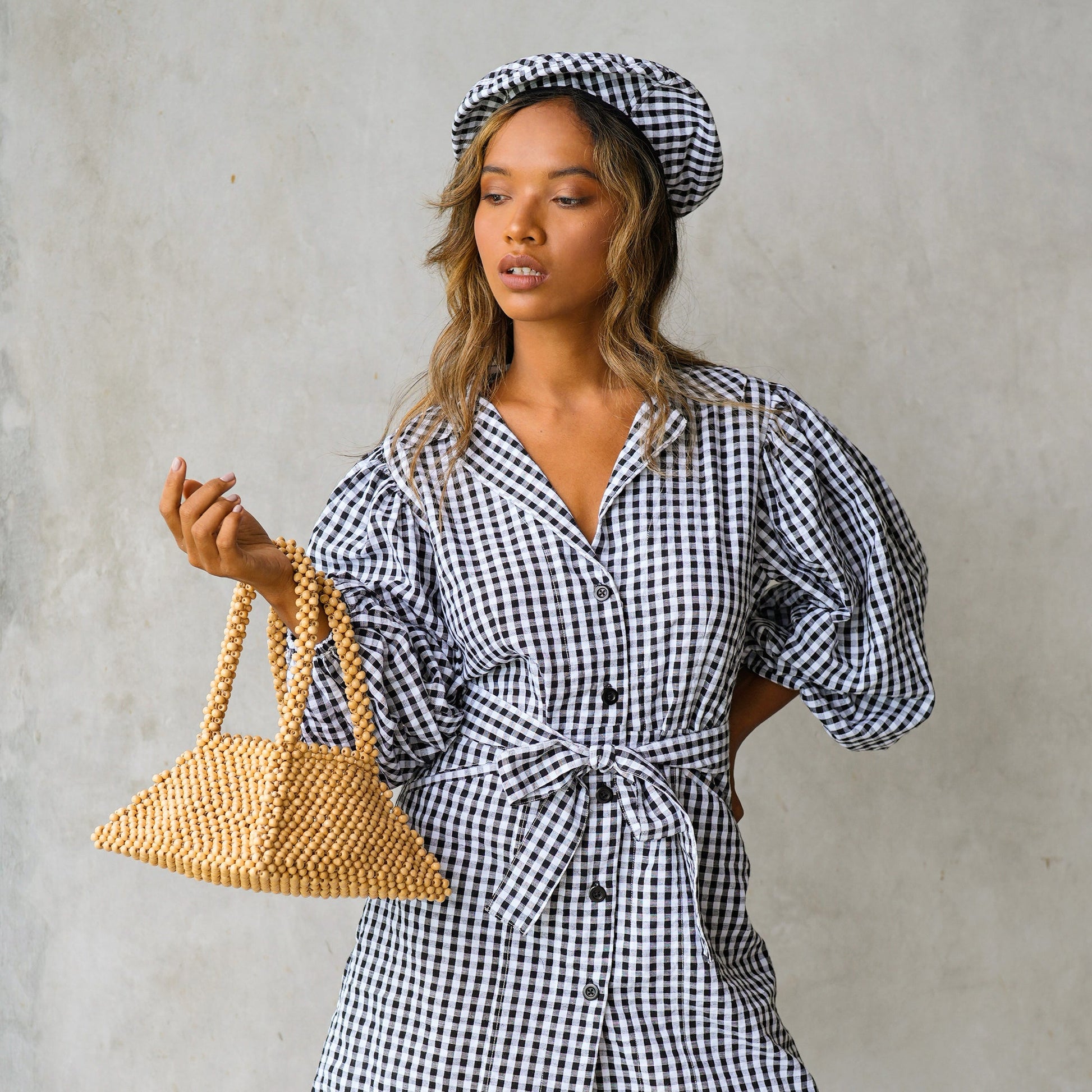 This Pyramid bag is a museum-worthy, sculptural beads piece that strikes a cool, coastal ease. Crafted of natural wooden beads, this arm purse features a sturdy 3-dimensional pyramid shape with 2 bag handles. Show yours off with our Meghan mini gingham dress and your favorite espadrilles.